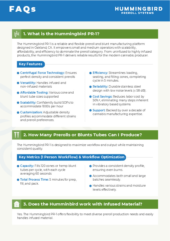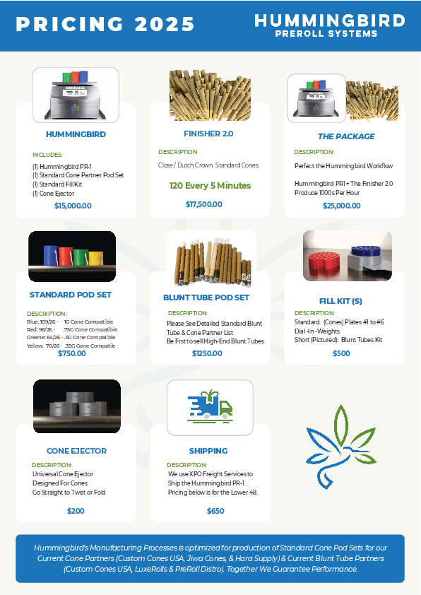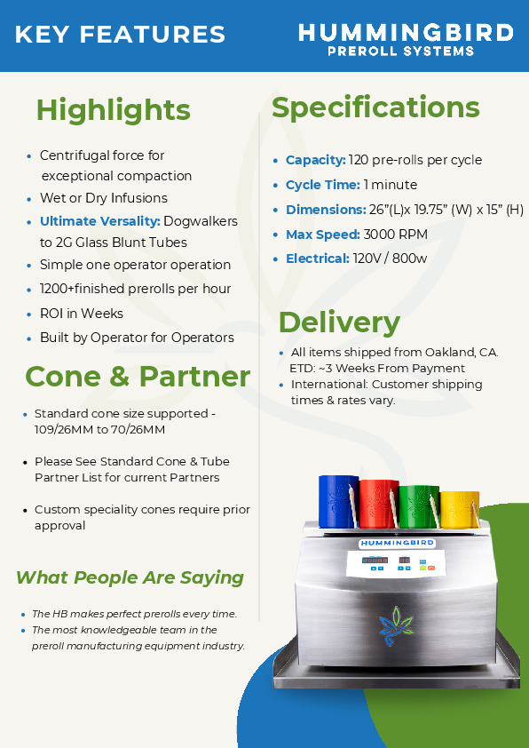 What we offer:We are Hummingbird Preroll Systems, offering the most complete and affordable solution on the market for small to high-volume producers. From dog walkers to large-scale manufacturers, our machines provide unmatched versatility and efficiency.